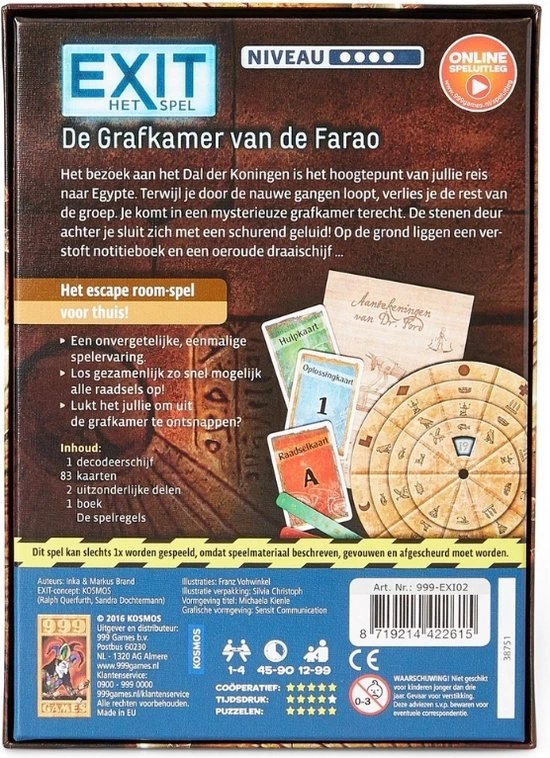 Het uitdagende coöperatieve escape room-spel! Ontsnap zo snel mogelijk uit de griezelige grafkamer. Probeer binnen anderhalf uur alle puzzels op te lossen en alle codes te breken. Alleen dan ontsnappen jullie uit de locatie waar jullie opgesloten zitten. Logisch nadenken en doorzettingsvermogen zijn vereist om dit spel tot een goed einde te brengen. En komen jullie er echt niet uit, dan bevat het spel tipkaarten om jullie op het goede spoor te brengen. EXIT: De Grafkamer van de Farao is maar één keer speelbaar omdat het speelmateriaal moet worden beschreven, gevouwen of afgescheurd. Maar net als in een echte escape room garanderen we een zeer intense puzzel- en speelervaring! De puzzels zijn vrij pittig. Daardoor is het spel vooral geschikt voor fervente puzzelaars en escape room-liefhebbers. Niveau: professional