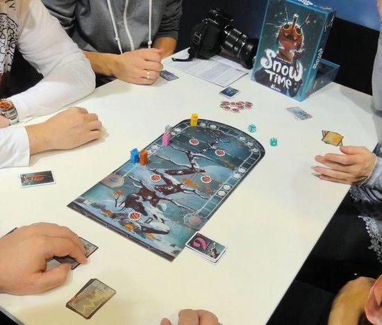 Snow is falling! Winter is finally here! A joust is in the making: let the show begin! You play as children, representing your village, and face your opponents in a joyful competition around a marvelous tree. Anticipate other players’ moves and guess their intentions. Be crafty, collect strange fruits, and dodge the snowballs!!Fruits appear randomly on the board at different levels of the tree. The players will try to seize them and therefore will have to choose on which branch they want to climb. Be careful though, a player will only be able to harvest fruits if he is alone on a branch, and if there is not a player in ambush just above him! Thus, He will try to anticipate the choices of his opponents since otherwise a squabble will start, which will inevitably end up by the loss of cards, unless one of the brawlers dominates the fray. Finally, the cleverest player will score a point for avoiding the fight by being the lowest in the tree. Between racing game, bluff, and double guessing. Naam Speelduur Aantal spelers Leeftijd Uitgever Designer Soort Taal Taalonafhankelijk Snow Time 20-40 minuten 3-5 10+ Lui-même Frank Meyer Kaartspel, Bluffen Engels Ja ¬â€