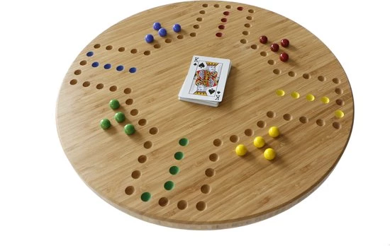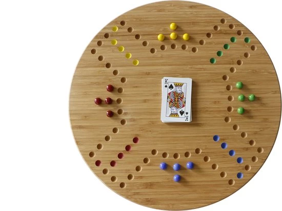 Gezelschap spel voor 4 personen, Het spel wordt met 4 personen gespeeld, waarvan er 2 min of meer samenspelen; dit betekent dat als ??n speler zijn 4 balletjes ?binnen? heeft, zijn medespeler hem/haar mag helpen. Maar er mag g??n mondeling overleg zijn. Gespeeld wordt met kaarten, zonder jokers, de spelregels zijn toegevoegd. Het spel vereist tactiek, strategische samenwerking en geluk.