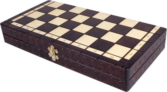 Dit schaakset heeft prachtige handgemaakte schaakstukken van beukenhout in natuurlijke en bruine kleuren. Het inklapbaar schaakbord heeft twee compartimenten afgewerkt met een vilten voering voor het opbergen van de schaakstukken binnenin. Decoratieve metalen scharniertjes houden het bord veilig vergrendeld na het spelen. Het heeft een prachtig klassiek ontwerp in combinatie met unieke patronen die decennia lang geweldig schaakspel zullen bieden.