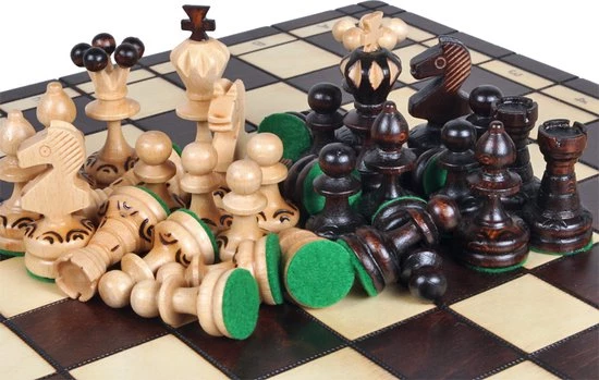 De schaakstukken zijn voorzien van groene vilt aan de onderkant om beschadigen van het schaakbord te verkomen.