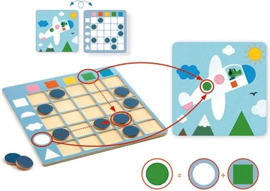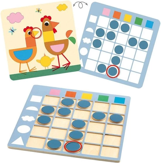 Welke vorm heeft de snavel van de kip? Met het educatieve spel “Coloformix” van het merk Djeco leren kinderen spelenderwijs kleuren en vormen herkennen.