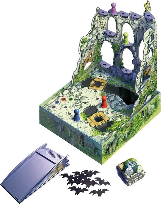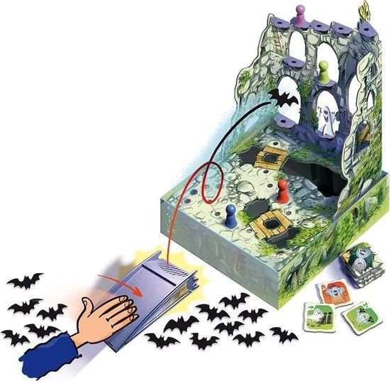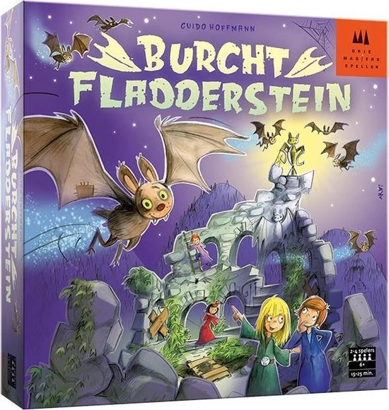Schiet met een speciale katapult vleermuizen van stof richting de driedimensionale burcht. De plek waar de vleermuis landt, bepaalt hoeveel stappen je met je pion mag doen. Zo levert een landing in het burchthof 1 stap op en een landing op de burcht zelf 2. Belandt een vleermuis in een burchtgraf, dan krijg je hulp van een spook. Wie als eerste boven is wint de magische vleermuisbokaal en het spel. Burcht Fladderstein is een prachtig vormgegeven behendigheidsspel, dat door het fladdereffect van de vleermuizen een levensechte belevenis biedt.