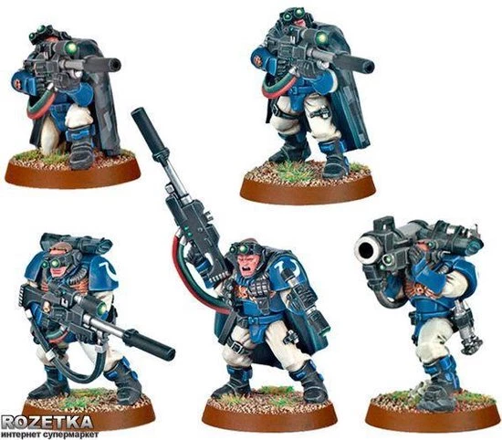 Deze doos bevat vijf meerdelige plastic Space Marine Scouts met sluipschutter geweren . De modellen worden geleverd met 25mm ronde basissen.
