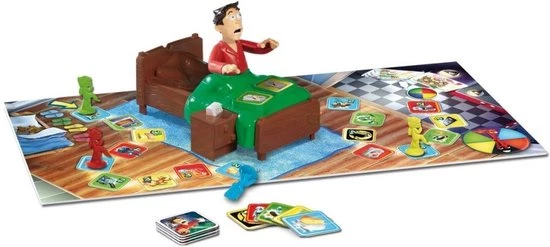 Zet het bord in het midden van de tafel en leg Papa op het bed in z’n slaappositie. Zet hem nu aan en hoor hem snurken. Iedere speler kiest nu een kleur figuur en de kaartjes worden geschud en verdeeld onder de spelers. Op het bord zie je allerlei verschillende gebeurtenissen die Papa wakker zouden kunnen maken, zoals het vallen van borden, de kat wordt opgeschrikt enzovoorts. Op de kaarten die de spelers hebben gekregen zie je deze gebeurtenissen weer terug. Als je op een vakje belandt waarvan jij dezelfde gebeurteniskaart hebt, dan ben je beschermd en hoef je niet op de knop te drukken. Maar heb je deze beschermkaart niet, dan moet je het aantal keer op de knop naast Papa z’n bed drukken als staat aangegeven op het bord. Pas wel op! Want als Papa wakker schrikt tijdens jouw beurt, word je weer naar bed gestuurd! Wie het eerste bij de koelkast aankomt is de winnaar.