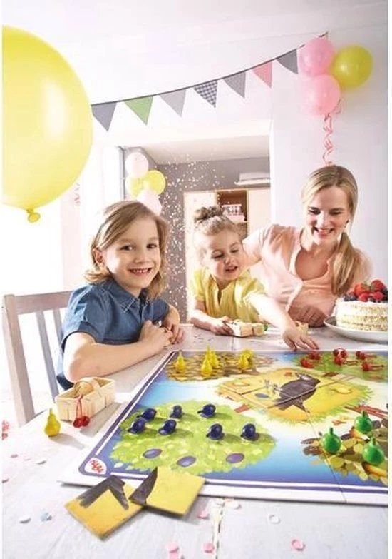 Potverdrie de raaf wil de rijpe vruchten pikken! Maar de kinderen werken samen en verzamelen zoveel kersen pruimen peren en appels als ze kunnen.