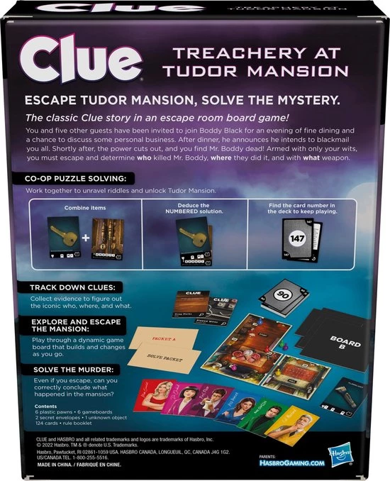 Roep vrienden en familie bij elkaar voor een spelavond die ze niet snel zullen vergeten, een filmisch, single-play-avontuur. Dit escaperoom-spel is voor 1-6 spelers vanaf 10 jaar en een ideaal cadeau voor fans van moordmysteries. Hasbro Gaming en alle gerelateerde handelsmerken en logo’s zijn handelsmerken van Hasbro, Inc.