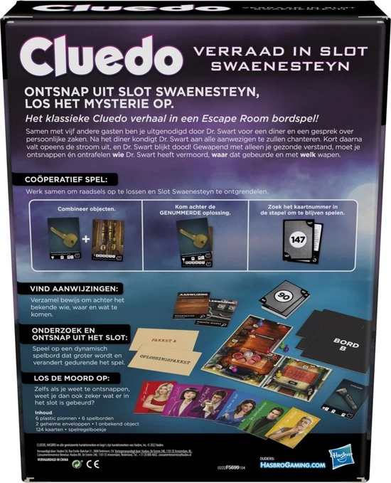 Het detective- en ontsnappingsbordspel Cluedo Verraad in Slot Swaenesteyn plaatst de klassieke Cluedo-personages en het verhaal in een meeslepende escaperoomervaring, waarin spelers direct van start kunnen met een beperkte voorbereiding. Spelers verplaatsen hun pionnen over het spelbord dat kamer voor kamer wordt uitgebreid, terwijl ze speuren in het slot, kaarten trekken, puzzels oplossen, nieuwe kamers ontgrendelen en logisch nadenken om aanwijzingen te ontdekken. Na ontsnapping uit het slot bekijken de spelers de aanwijzingen die ze hebben verzameld, om de correcte beschuldiging te doen en het spel te winnen.