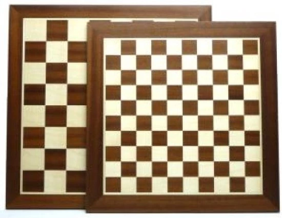Dit schaak- en dambord is dubbelzijdig ingelegd. Een zijde schaak en een zijde dam. Geheel ingelegd hout, mahonie en ahorn. Veldmaat van de schaakzijde is 50 mm, 64 velden. Geschikt voor Stauton stukken, maat 4 of 5. Veldmaat van de damzijde is 40 mm, 100 velden. Afmetingen: ca. 48 x 48 cm.