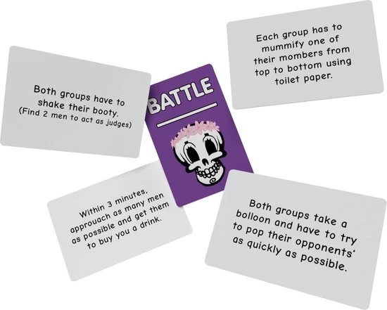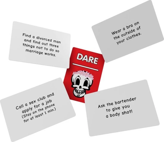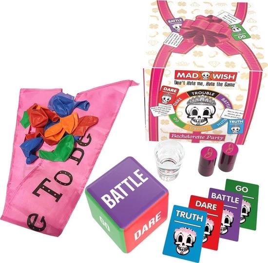 Ga je binnenkort trouwen? Met MadWish Hen Edition wordt dit het meest originele vrijgezellenfeest ooit. MadWish Hen Party is het ultieme spel voor een geslaagd vrijgezellen feest. Ga je de uitdaging aan of vertel je je vrienden je diepste geheimen? Zo niet, neem een SHOT! Er geldt maar 1 regel in MadWish Hen: Don’t hate me, Hate the game! Inhoud: 1 grote dobbelsteen 6 cm x 6 cm x 6 cm 1 shot-glaasje 50 Jokers 50 BATTLE opdrachtkaarten 50 GO opdrachtkaarten 75 TRUTH opdracht kaarten 75 DARE- opdracht kaarten 15 ballonnen Spelregels