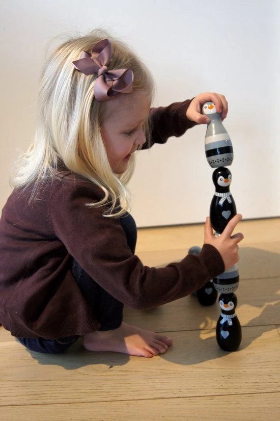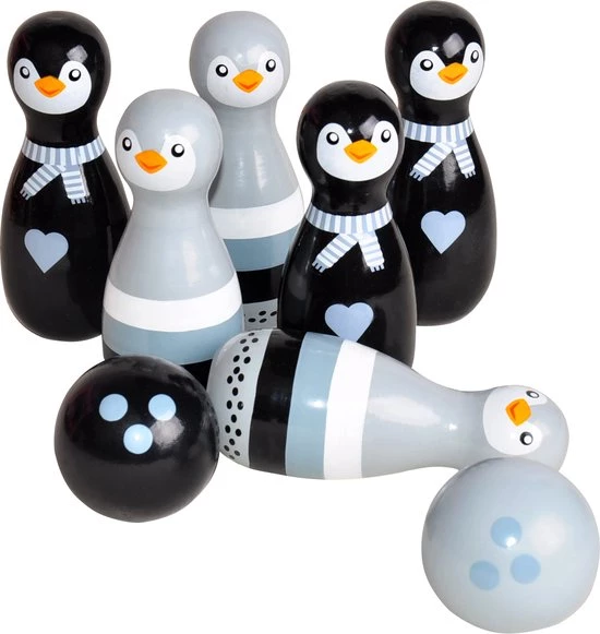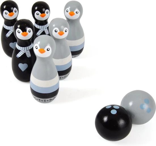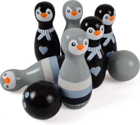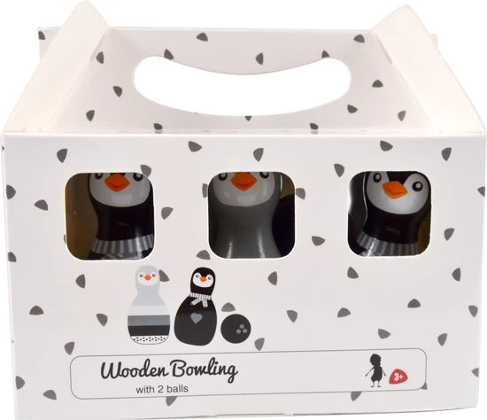 | Verpakkingsinhoud | 1, x, bowling, set, pinguïn, met, 6, pionnen, en, 2, bowlingballen, van, hout |
