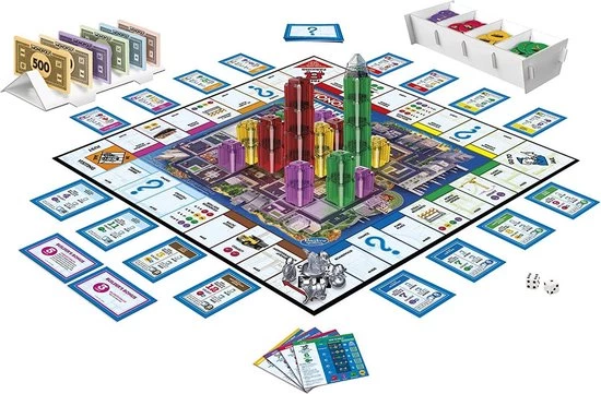 HET IS EEN ANDERE SPIN AAN KLASSIEKE MONOPOLY-GAMEPLAY met dit strategiespel waarin spelers onroerend goed kopen en gebouwen fysiek stapelen met de bouwstenen