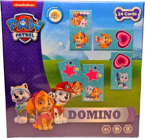 De eerste speler legt een Paw Patrol dominosteen in het midden. De volgende speler moet, als hij/zij kan, een dominosteen met dezelfde afbeelding in het verlengde leggen van de Paw Patrol dominosteen die al op tafel ligt, met de uiteinden tegen elkaar. Dubbelen moeten in een rechte hoek ten opzichte van alle andere dominostenen worden gelegd, zodat dominostenen in alle vier de richtingen kunnen worden aangesloten. Als een speler geen Paw Patrol dominosteen heeft die overeenkomt met wat er ligt, moet de speler een steen van de ?stapel? pakken totdat hij/zij er een heeft die wel kan. Als alle Paw Patrol dominostenen in de ?stapel? op zijn en er geen juiste dominosteen is gevonden, verliest de speler zijn/haar beurt. De winnaar is de eerste speler die al zijn/haar Paw Patrol dominostenen heeft gelegd.