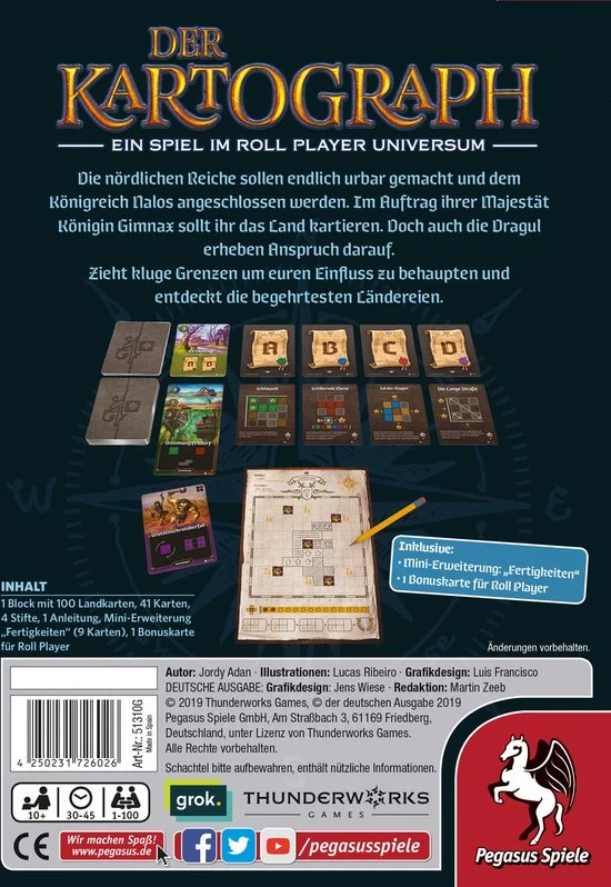 Pegasus Spiele The cartographer. Speeltijd (max): 45 min, Doelpubliek: Volwassenen en kinderen, Aanbevolen geslacht: Elk geslacht. Gewicht: 480 g, Breedte: 146 mm, Diepte: 38 mm