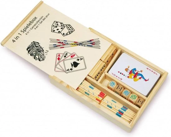 4 spellen in een handige box, die in iedere koffer past en op regendagen de verveling verdrijft.