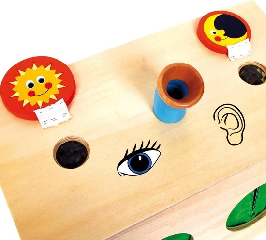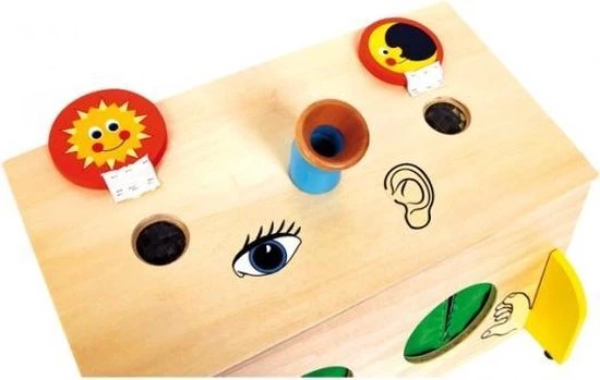 Ontdek de wereld met alle zintuigen ? spannend en opwindend. Deze geweldige box is gemaakt uit bont en transparant gelakt laaghout in combinatie met zwarte textiel. 2 met textiel beklede openingen geven toegang, 2 prisma lenzen laten de ogen een beetje vermoeden, een kleine trechter in het deksel laat kinderen de oren spitsen. Hoe kan het zijn dat hier binnen iets is? De lenzen worden middels bont gelakte en klapbaare deksels met son- maan-motief verdekt. Fantastisch geschikt om met vormen of zakjes met verschillenen vullingen kennis te maken!