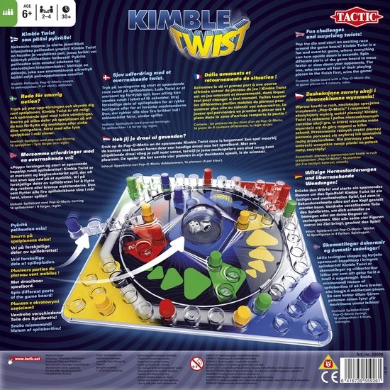 Kimble Twist! Heb jij je draai al gevonden? Druk op de Pop-O-Matic en de spannende Kimble Twist Race is begonnen! Een spel waarbij de kansen snel kunnen keren door een handige draai aan het speelbord. Met een uitgekiende draai vlieg je zelf naar voren, terwijl je jouw medespelers een eind terug kunt plaatsen. De speler die het eerst vier pionnen in zijn thuisbasis speelt is de winnaar.