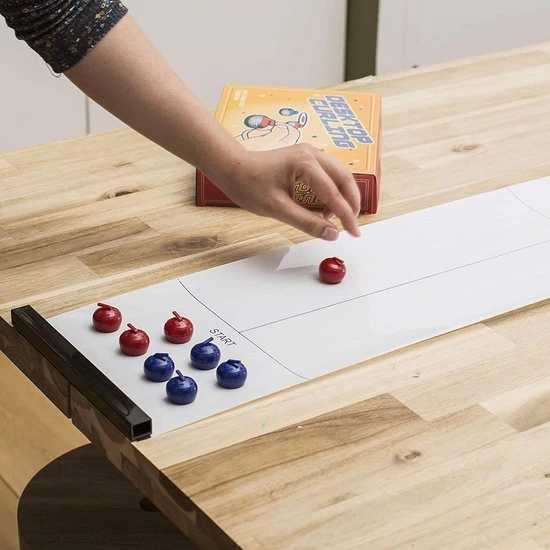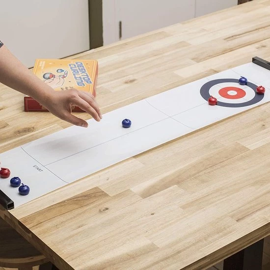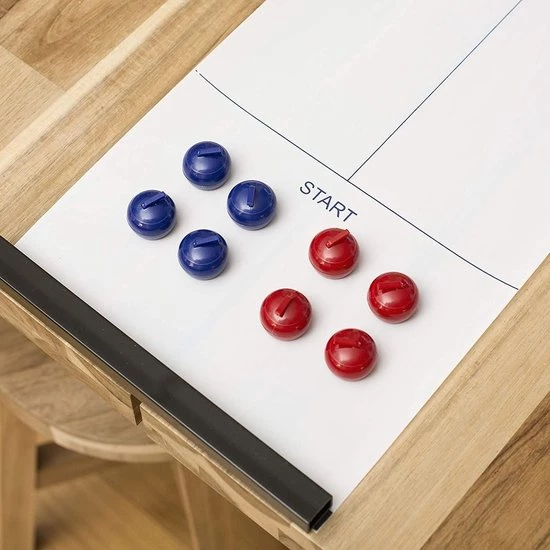 Perfectioneer je curlingvaardigheden vanuit je werkplaats. Schuif de meegeleverde curlingstenen langs je bureau en richting het doelwit. Er zijn in totaal acht stenen – vier blauwe en vier rode – dus je kunt een team aan de gang krijgen op kantoor.