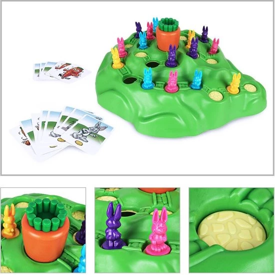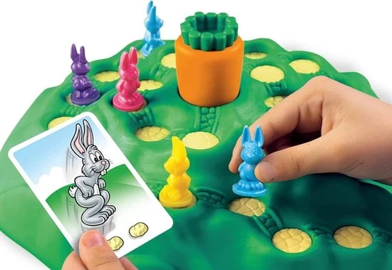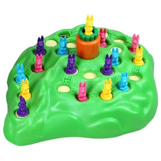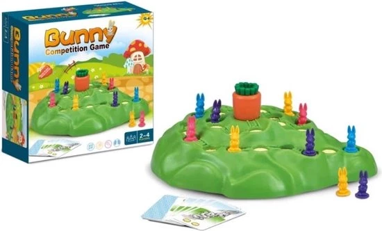 Het Konijnenrace gezelschapsspel is eenvoudig in elkaar te zetten en heeft eenvoudige regels. Het doel van het familiespel is om met je konijn de top van de heuvel te bereiken.